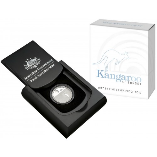 The 2017 $1 Kangaroo at Sunset Silver Proof Coin is a .999 fine silver, proof-finish Australian coin from the Royal Australian Mint, featuring a silhouette of a kangaroo at sunset, with specifications including a 6.03g weight (about 1/10 oz), 21.69mm diameter, and a limited mintage of 5,000, presented with a Certificate of Authenticity.